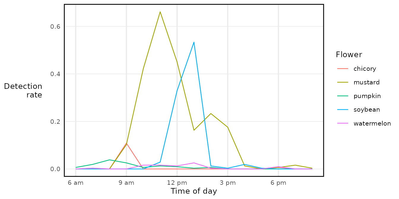 labs(x = 'Time of day', y = 'Detection\nrate', color = 'Flower') +